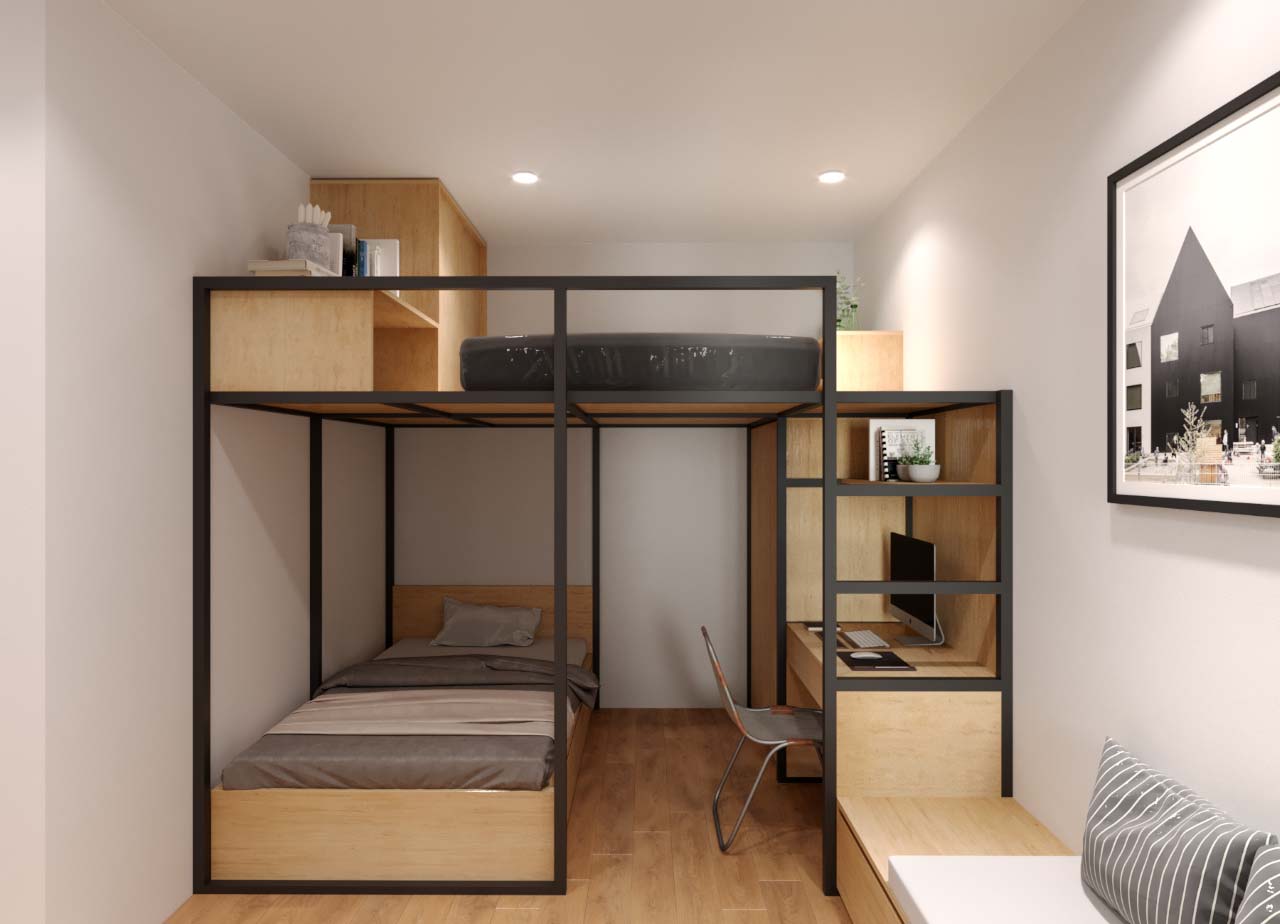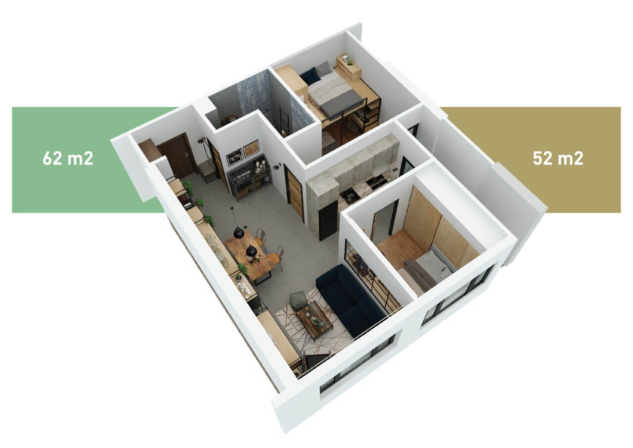 Căn hộ bao gồm 2 phòng ngủ riêng biệt, 1 nhà vệ sinh, ban công và cửa sổ mở đón nắng và gió, phòng khách rộng thoáng là nơi sum vầy của gia đình, đặc biệt phù hợp với những gia đình trẻ hiện đại.