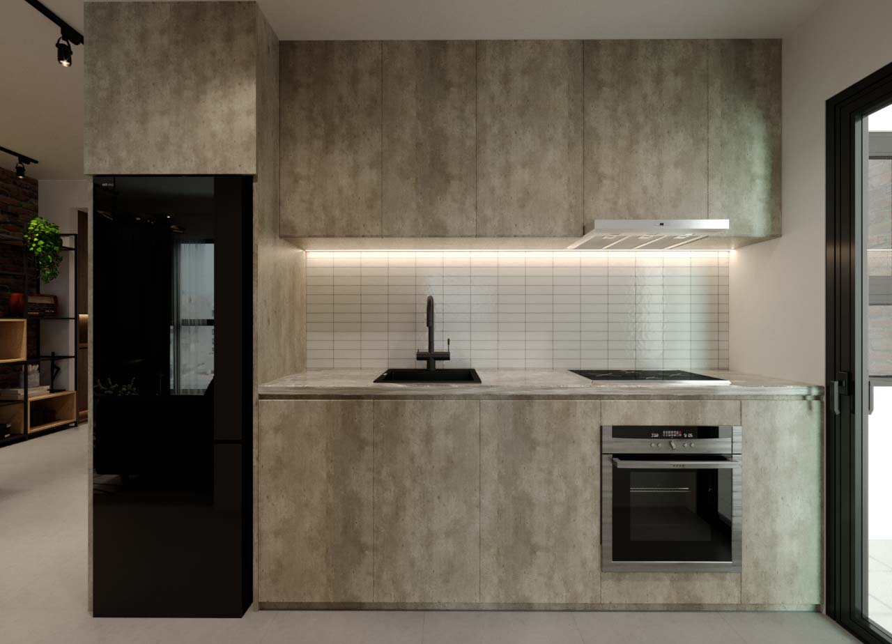 Màu sắc thường được sử dụng trong phong cách này là màu tối, sẫm như màu đen, xám, nâu đậm. Sàn gỗ và sàn bê tông được lựa chọn làm vật liệu chủ đạo cho căn hộ mang phong cách công nghiệp. Trần nhà và sàn bếp sẽ dùng vật liệu (hoặc vật liệu có màu sắc) bê tông mài để tạo sự rạch ròi trong không gian. Các tấm vách kính ngăn phòng sẽ được làm bằng kim loại và sơn đen tĩnh điện để tạo nên sự khỏe khoắn trong đường nét thiết kế của căn hộ. Sofa và ghế đôn làm bằng chất liệu da công nghiệp với màu sắc tối tạo vẻ xù xì và mạnh mẽ cho không gian. Bên cạnh đó, các đồ nội thất trang trí sẽ được dùng giới hạn trong phong cách công nghiệp, chỉ một số ít cây xanh và các đồ dùng trang trí được sử dụng trong thiết kế nội thất.