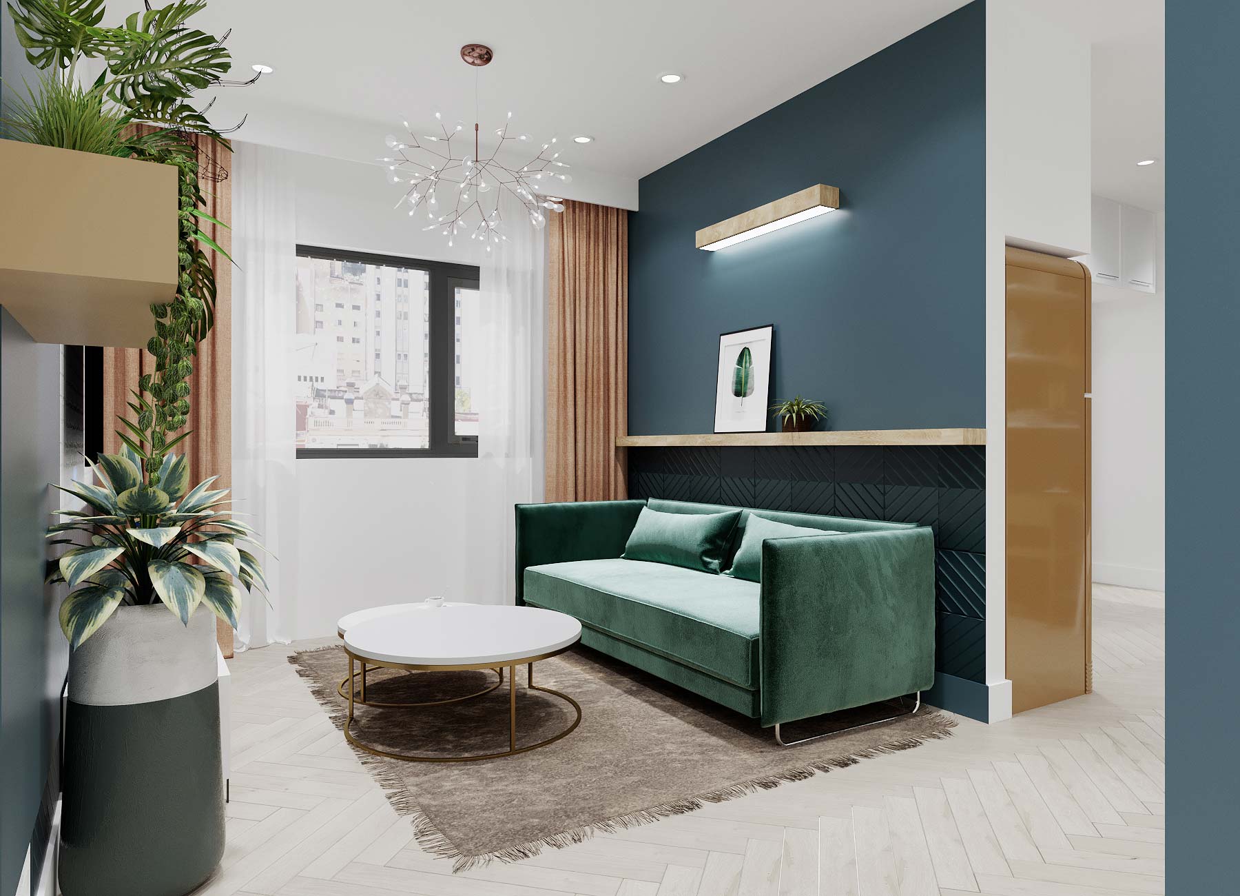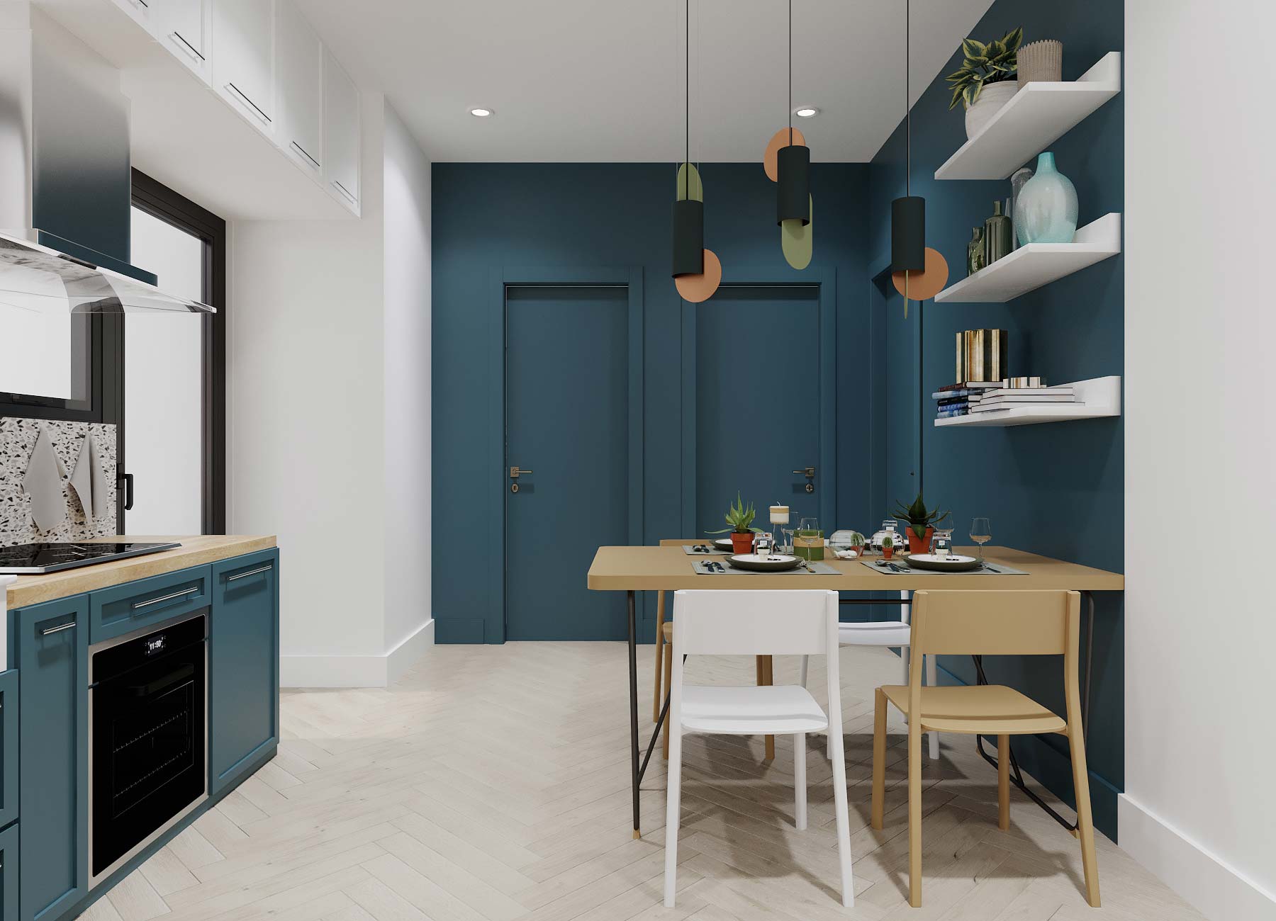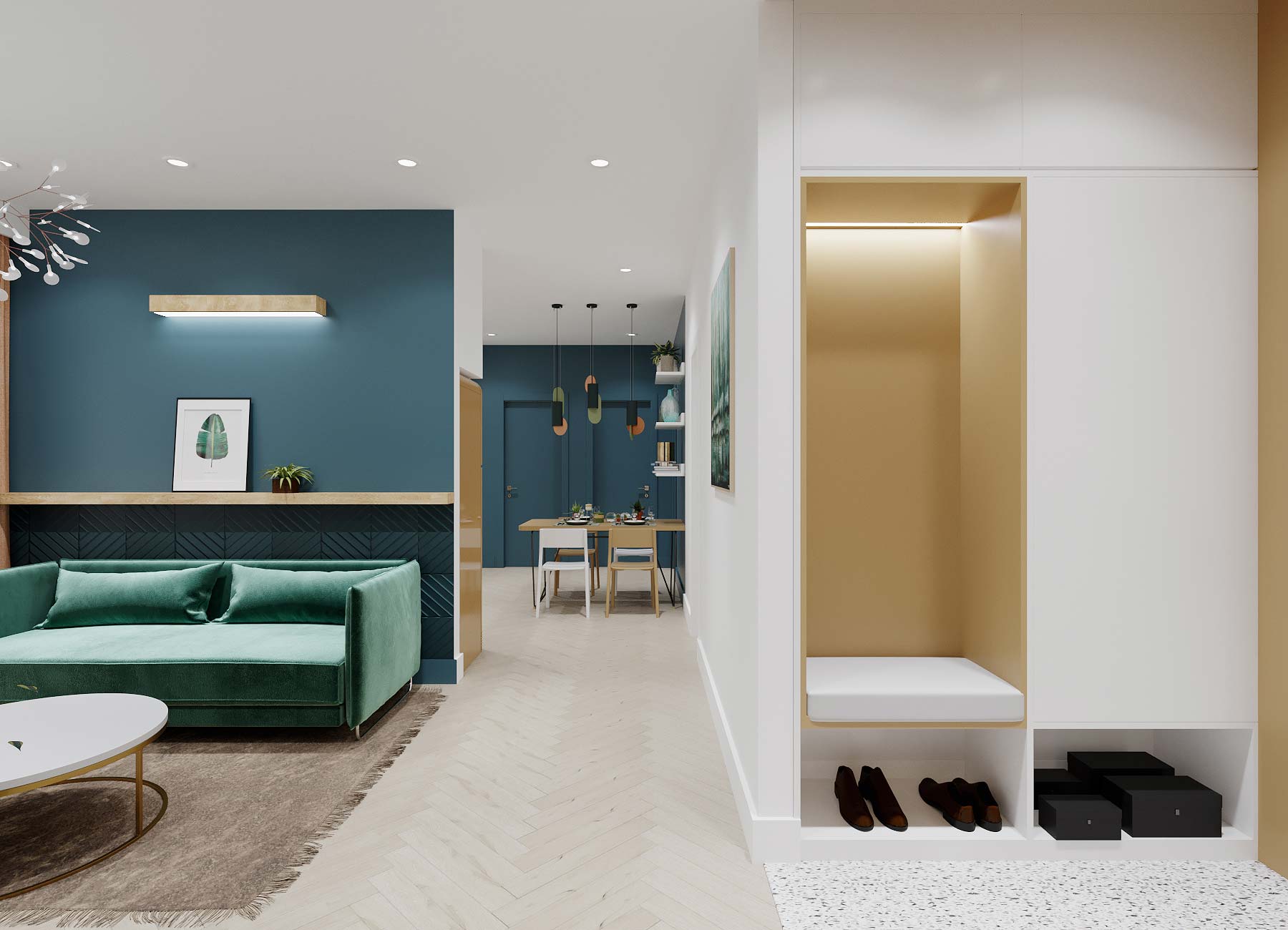 Các màu sắc sẽ được kết hợp hài hòa giữa tường, trần, sàn và đồ vật để không gây nên sự ức chế cho gia chủ. Vận dụng tỷ lệ hình học, các mảng tường sẽ được sơn dàn trải theo chiều ngang căn hộ để đánh lừa thị giác, tạo cảm giác không gian lớn hơn và thoáng đãng hơn. Phòng ngủ sẽ được sơn gam màu trung tính nhưng vẫn có điểm nhấn trong các đồ vật rời như ghế, đôn, bàn làm việc và bàn trang điểm. Bếp sẽ được thiết kế gọn gàng và tiết chế chi tiết, sử dụng linh hoạt các màu sắc tươi sáng như xanh coban, ghi xám và đen để tạo sự ấn tượng.