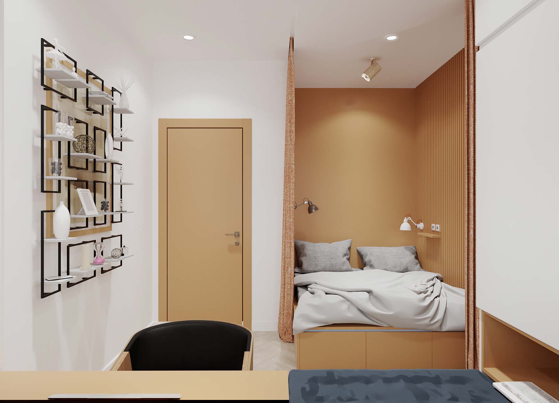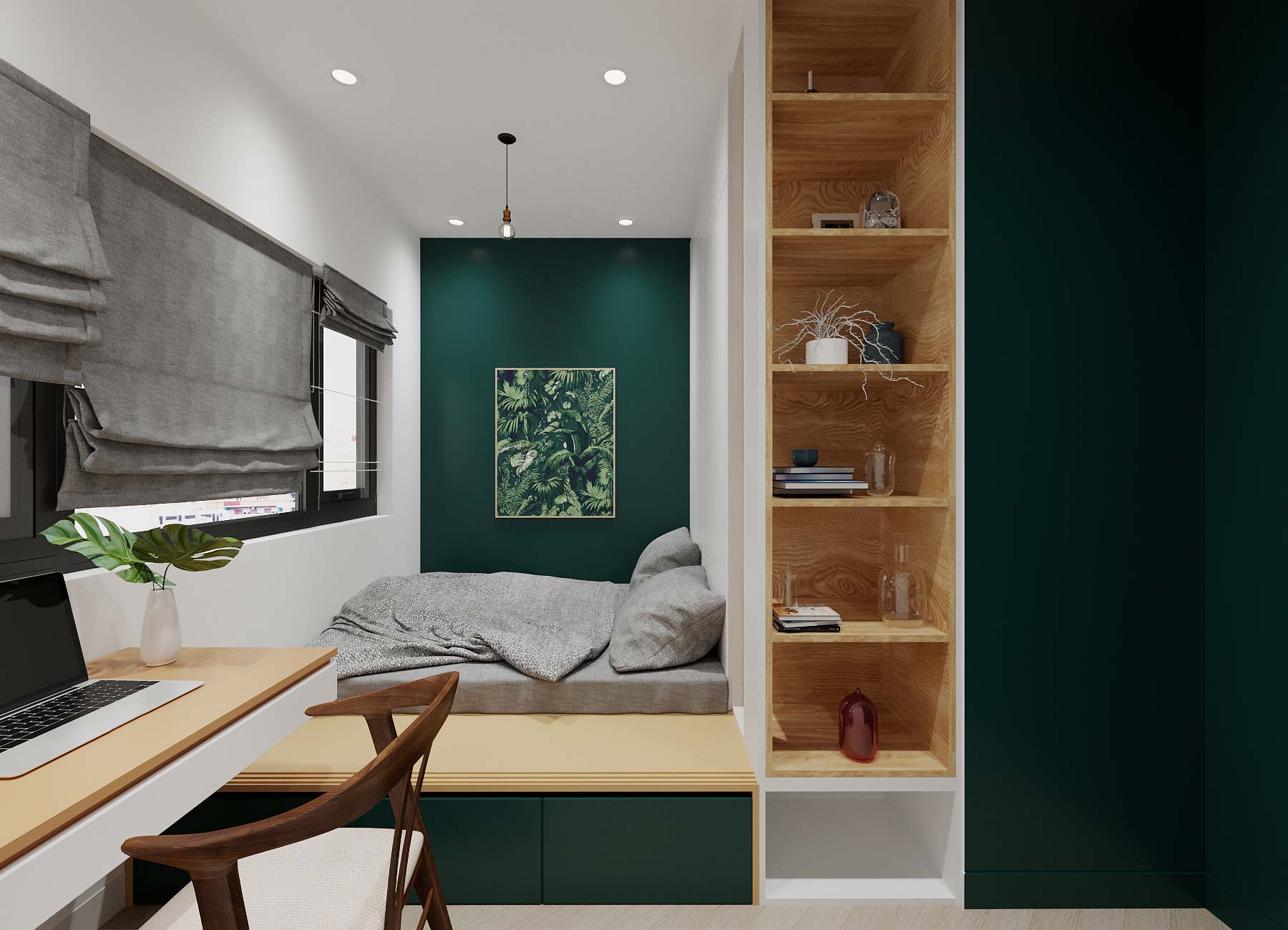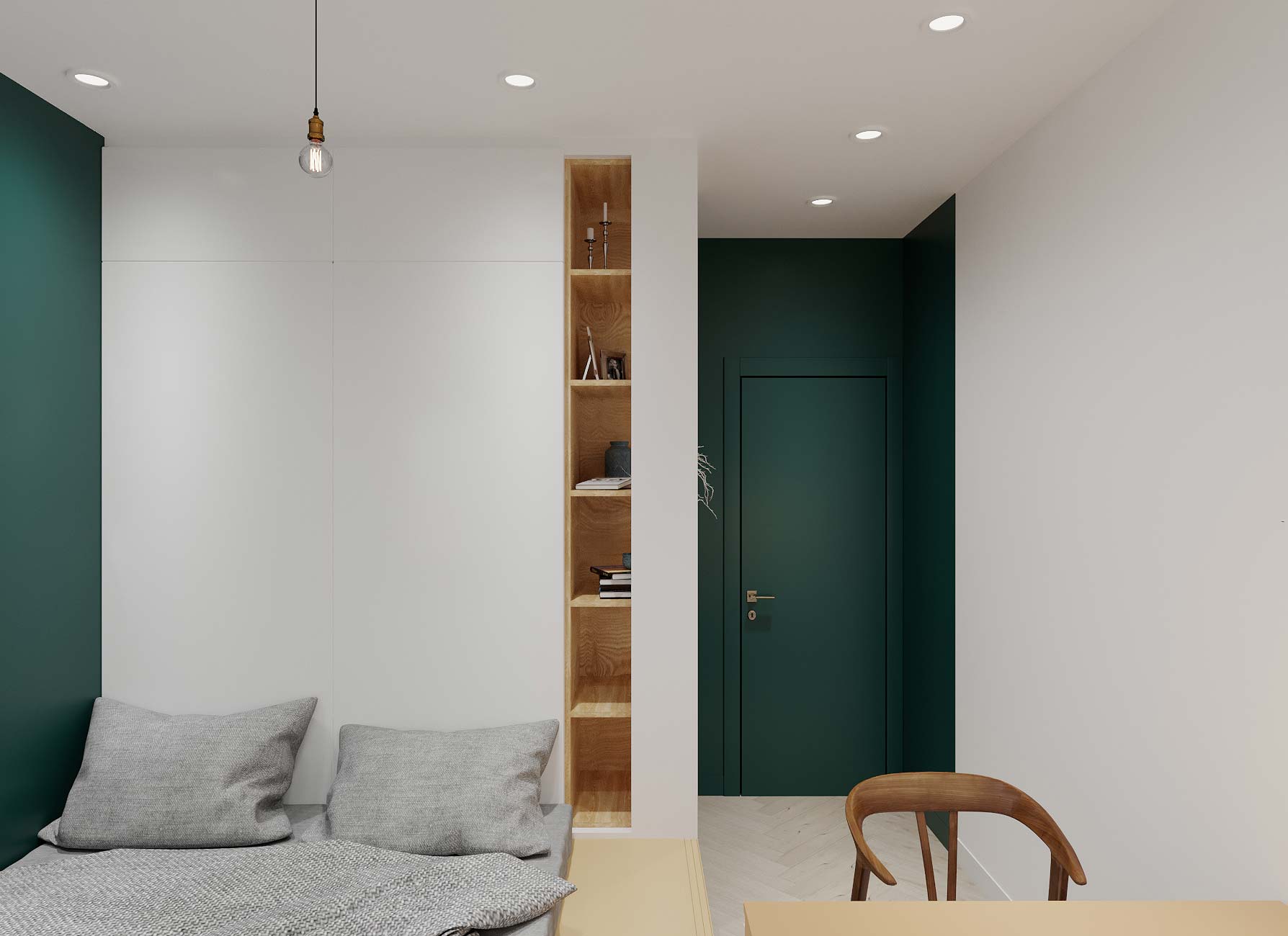 Các màu sắc sẽ được kết hợp hài hòa giữa tường, trần, sàn và đồ vật để không gây nên sự ức chế cho gia chủ. Vận dụng tỷ lệ hình học, các mảng tường sẽ được sơn dàn trải theo chiều ngang căn hộ để đánh lừa thị giác, tạo cảm giác không gian lớn hơn và thoáng đãng hơn. Phòng ngủ sẽ được sơn gam màu trung tính nhưng vẫn có điểm nhấn trong các đồ vật rời như ghế, đôn, bàn làm việc và bàn trang điểm. Bếp sẽ được thiết kế gọn gàng và tiết chế chi tiết, sử dụng linh hoạt các màu sắc tươi sáng như xanh coban, ghi xám và đen để tạo sự ấn tượng.